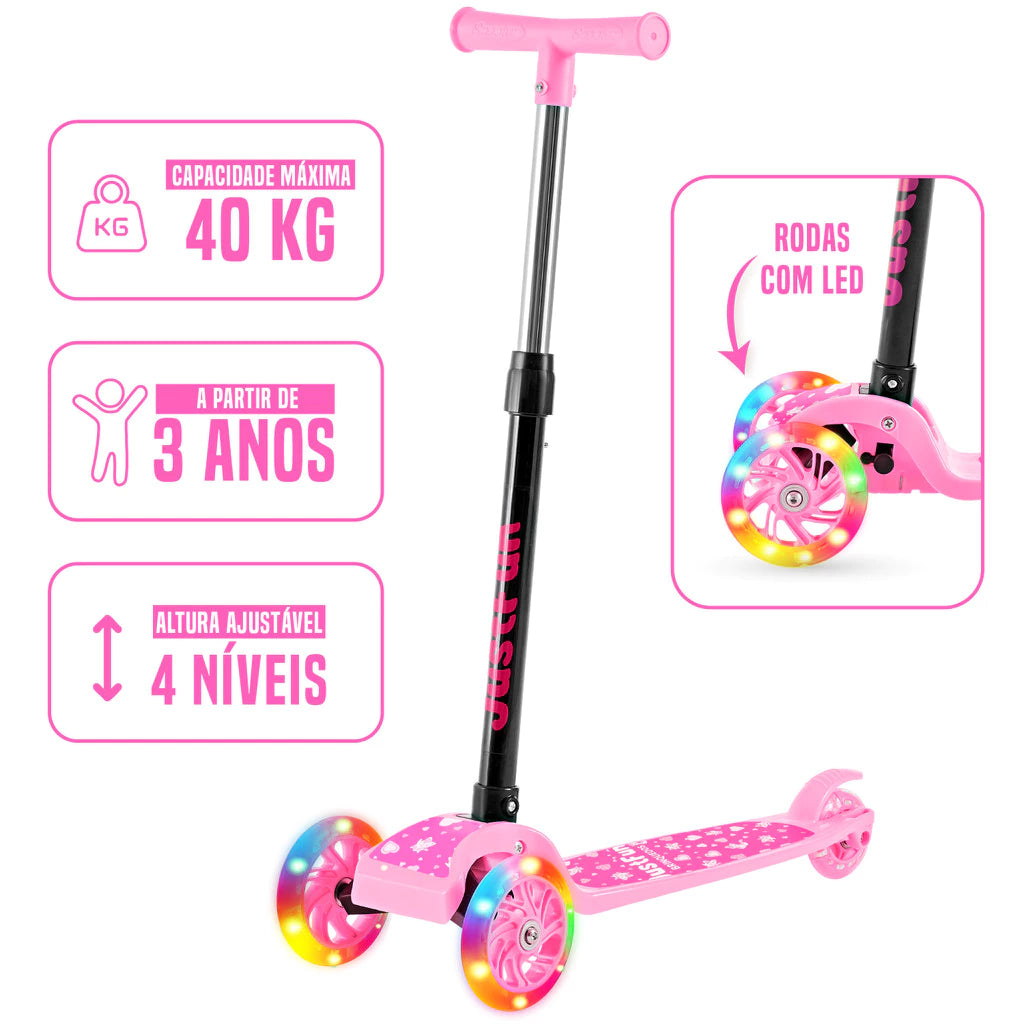 Proporcione momentos de alegria, movimento e aprendizado com o Patinete Infantil 3 Rodas de LED Dobrável – o presente perfeito para fazer seu pequeno brilhar de felicidade!