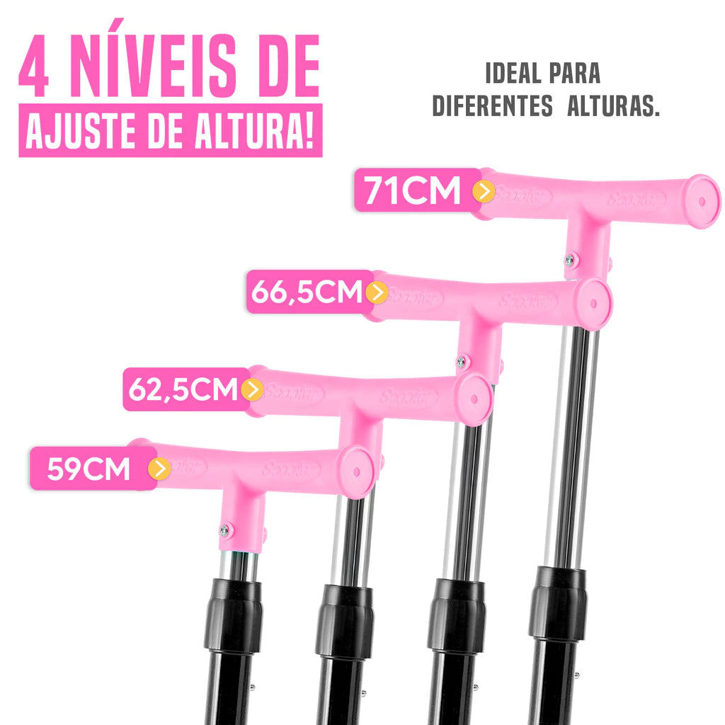 O sistema dobrável torna o patinete extremamente prático para transportar e guardar, perfeito para levar em viagens, passeios ao parque ou até mesmo para brincar na calçada de casa. Além disso, o guia ajustável acompanha o crescimento da criança, garantindo conforto e durabilidade por muito mais tempo.