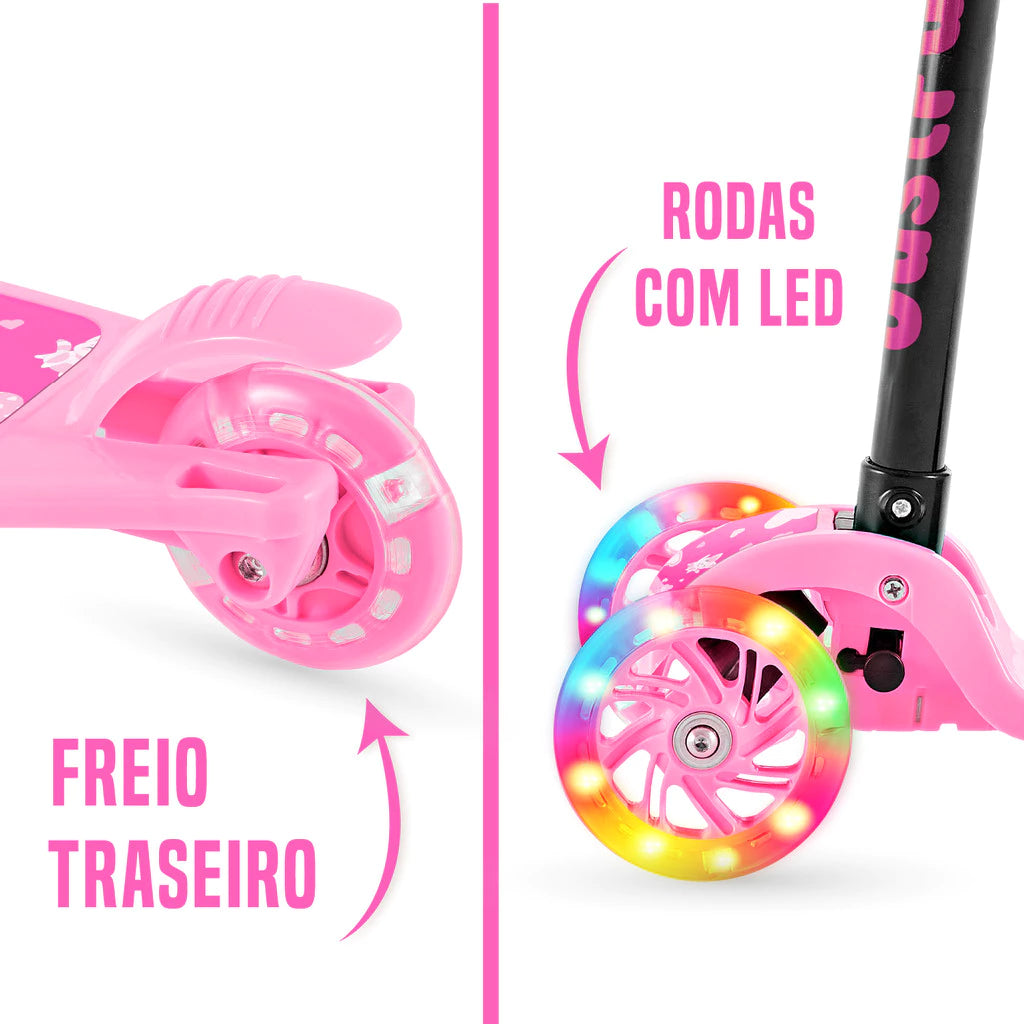 Com design de 3 rodas, ele oferece estabilidade e equilíbrio, ideal para crianças que estão aprendendo a se locomover com confiança. As rodas com luzes de LED coloridas dão um toque mágico a cada passeio, chamando a atenção por onde passam e aumentando a visibilidade e segurança, principalmente em ambientes com pouca luz.